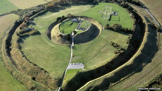 The site of Old Sarum appears today as a ruined hilltop bailey.