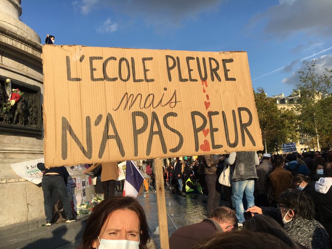 A large crowd gathered in the place de la République in Paris to condemn the horrific act of violence against a teacher. Protesters carried signs specifically supporting teachers: “Je suis enseignant” (I am a teacher), “Je suis prof” (I am a professor or teacher), and “Nous, profs, enseignons la liberté d’expression et ça va continuer” (We teachers teach freedom of speech and this will continue), and “L’école pleure mais n’a pas peur” (Schools cry but don’t fear).