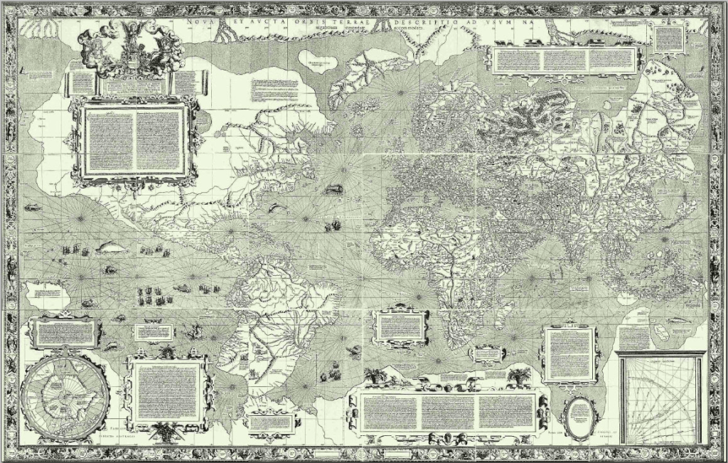 The Mercator projection also became very popular for prestige world maps that showcased empires, kingdoms, and cultures around the world. This map by Claes Jansz Visscher shows how elaborate such prestige world maps became by the mid-seventeenth century.